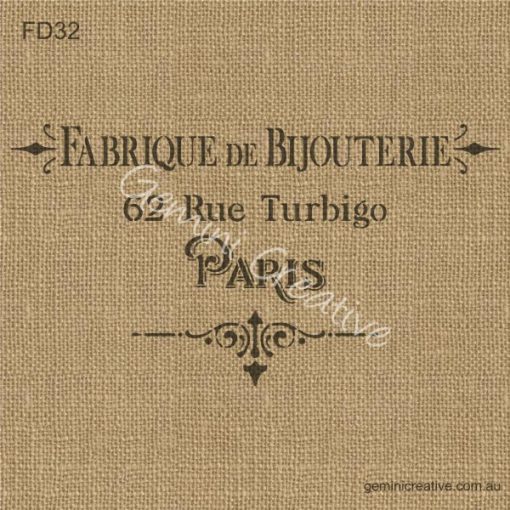 Element 3 StencilPrev Floral Border 5 StencilNext Sold out! Fabrique de Bijouterie Stencil$20.00 French sign stencil. Please note the 30cm size does not have the shadow text on the word Paris. Laser cut 10mil polyester (Mylar®), reusable, flexible and easy to clean. Sold out! Category: Gemini Creative Stencils Tags: Other, Stencils Related products Sold out! Posh Chalk Stencil Posh Birds and Bendy Branches $15.95 Posh Chalk Pigments & StencilsRead more Sold out! Posh Chalk Stencil Aged Wallpaper $39.95 Posh Chalk Pigments & StencilsRead more Sold out! Vintage Stencil $16.00 Gemini Creative StencilsRead more Sold out! Rose Border Stencil $12.00 Gemini Creative StencilsRead more