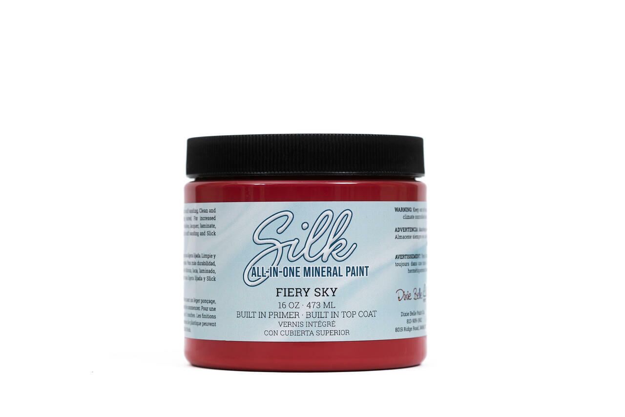 Desert Rose Silk Paint 16ozPrev Midnight Green Silk Paint 16ozNext Fiery Sky Silk Paint 16oz$42.95 Fiery Sky is a passionate, rich red that will add vibrancy to your home. This feisty color has a slight bluish undertone. Size Choose an option16ozClear Fiery Sky Silk Paint 16oz quantity Add to cart SKU: N/A Category: Dixie Belle Paint Tag: Silk Paints Additional information Additional information Weight N/A Size 16oz Related products No Pain Gel Stain 16 oz (Oil-Based) $69.95 Dixie Belle PaintSelect options This product has multiple variants. The options may be chosen on the product page Moonshine Metallics – Pacific $49.95 Dixie Belle PaintAdd to cart Whitewash Glaze $19.95 – $39.95Price range: $19.95 through $39.95 Dixie Belle PaintSelect options This product has multiple variants. The options may be chosen on the product page Dixie Mud (Brown) $23.95 Dixie Belle PaintAdd to cart